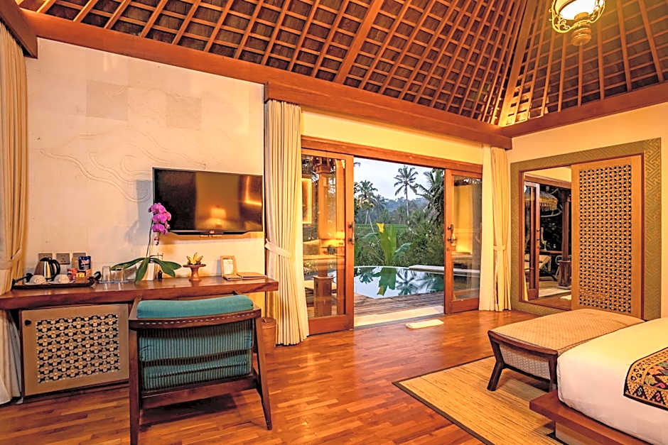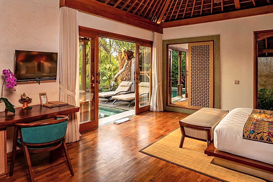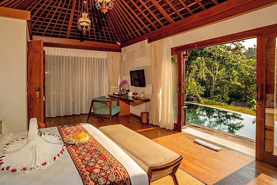 An outdoor infinity pool serves as a year-round centerpiece for daytime dips, with a sun deck and bar nearby for easy lounging. The hillside setting and garden views frame leisurely afternoons, while a private entrance adds a touch of exclusivity to the experience. It’s all designed to feel effortless and serene, with scenery that invites lingering under Bali’s skies.